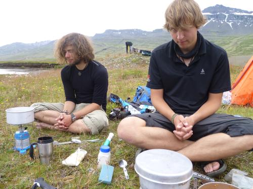 Wir finden ein wundervolles Plätzchen mit allem, was wir brauchen: Windschutz für das Zelt, egal wie stark, oder aus welcher Richtung er kommt, ein kleiner Gletscherbach, der uns mit Wasser versorgt und viele leckere Beeren um uns herum.