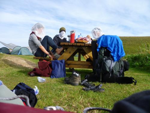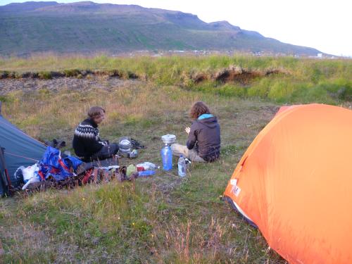Hier erleben wir leider auch unseren ersten Sturm im Zelt! Nachdem wir uns nach einem sonnigen Tag abends in unsere Schlafsäcke legen und die Augen zumachen, bemerken wir, dass Wind und Regen immer stärker werden. Leider müssen wir auch feststellen, dass der Wind gedreht hat, und aus einer für das Zelt eher ungünstigen Richtung kommt. Wer rechnet schon damit, dass der Wind nicht vom Meer, sondern vom Gletscher runter kommt??? Als der Wind unsere Apsis komplett niederdrückt, entschließen wir uns um halb 3 nachts, mit Sack und Pack ins Sanitärhäuschen des Campingplatzes umzuziehen. Als wir die Tür unseres Zeltes öffnen, um auch die Töpfe einzupacken, die wir nach dem Abendessen rausgestellt haben, damit der Regen sie abwäscht (wir sind ja schließlich im Urlaub ;-) ) müssen wir leider feststellen, dass sie nicht mehr da sind… sie sind spurlos verschwunden. Also ab in die Regensachen und raus in die große, kalte Waschküche, um unsere Töpfe zu suchen... leider erfolglos. Nichtmal in der nächsten Hecke klemmen sie. Mist!!!