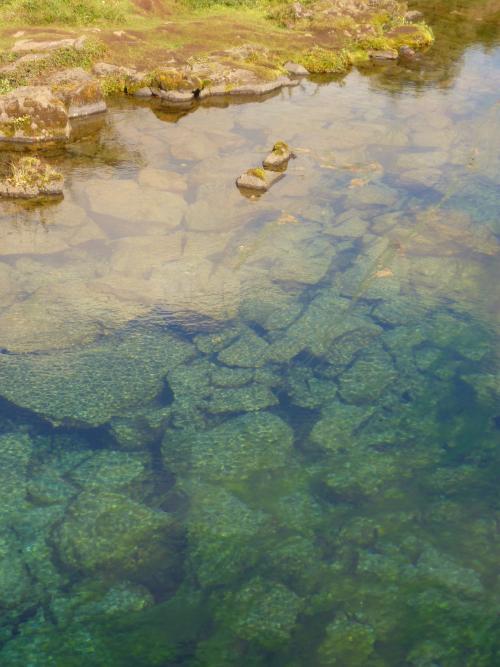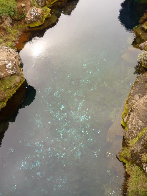 Durch das glasklare Wasser kann man bis auf den Grund der 12m tiefen tektonischen Spalten blicken