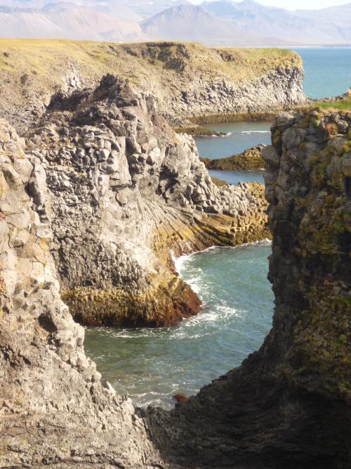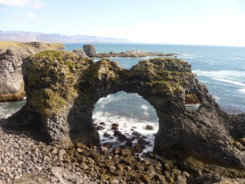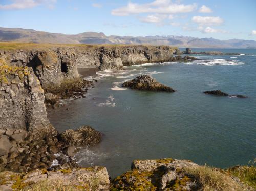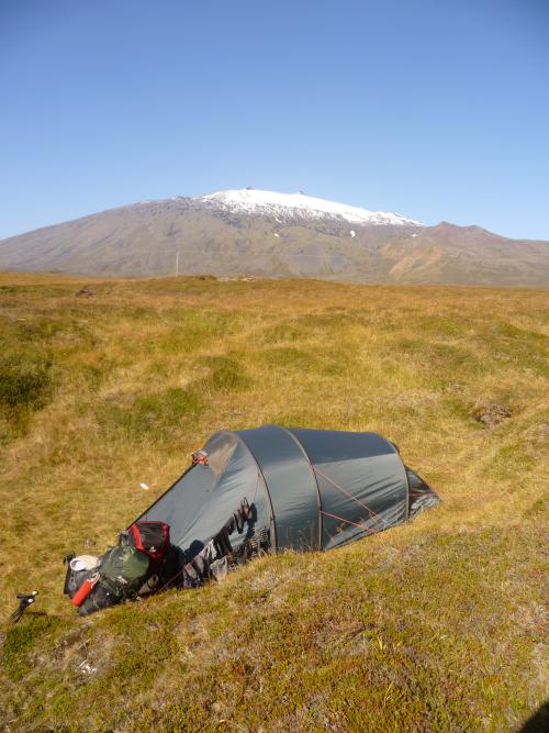 Wir leisten uns also das Busticket nach Snaefellsnes, in der Hoffnung, den Rückweg nach Reykjavik trampen zu können um so den Geldbeutel zu schonen. Unser Busticket endet in Vegamót, einer kleinen Stadt –so zumindest sagt es unsere Islandkarte. Doch vor Ort Stellen wir fest, dass es hier: Eine geschlossene Tankstelle, eine Straßenkreuzung, zwei Laternen, Lavafelder und natürlich -um alles perfekt zu machen- schreckliches Wetter gibt. Also: Daumen raus und hoffen. Wir haben schon nach 10 Minuten Glück. Zwei Isländer laden uns, pitschnass wie wir sind, in ihren Super-Jeep ein und nehmen uns bis Arnarstapi mit, wo es einen Campingplatz gibt. Wie wir am nächsten Tag feststellen können, ist es hier wunderschön! Fantastische Klippen, an denen sich die aufschäumenden Wellen brechen, im Wind segelnde Möwen und ein super Blick vom Zelt aus auf das unendliche Meer…