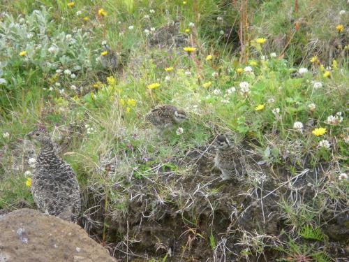 Bisher haben wir auf unseren 5 Wanderungen auf den Valanhnukur jedes mal eine Ptarmigan (Alpenschneehuhn) Familie gesehen.